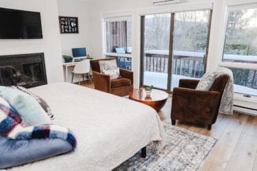 This condo is all about finding comfort and relaxation after a day of action and adventure. The living room features a wood-burning, stone fireplace and a full wall of windows and a sliding door overlooking birch trees, mountains and a pond. The back deck is the perfect spot to enjoy a warm drink or cocktail while watching the sunset and then gazing up at the stars by night.