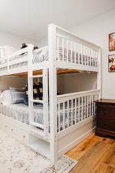 On the second floor, you’ll find another master bedroom with full en-suite bathroom, a full bathroom in the hallway, a bunk room with twin and full bunks, and a large second living room / bedroom combo with fireplace and private terrace (twin daybed with a king bed trundle for flexible sleeping arrangements).