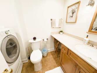 On the first floor, you’ll find a huge living room and kitchen with an open floor plan, a large master bedroom with en-suite full bath, and laundry room / 1/2 bathroom combo. The living room features a fireplace and sliding door to a private deck.